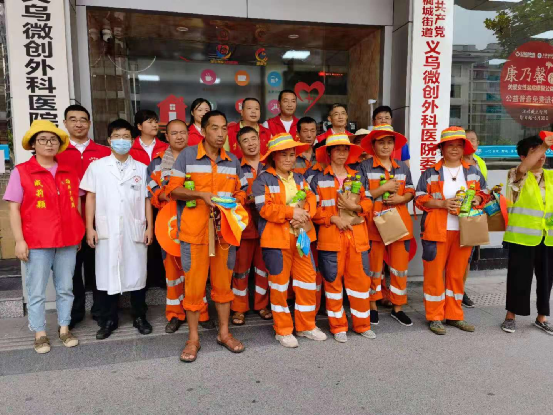 在慰问活动中,义乌附一微创医院给环卫工人们准备夏日用品,感谢他们为城市的文明建设所做出的贡献,嘱咐他们务必在工作时刻注意安全,做好高温防护措施,并表示炎炎夏日,欢迎经过附近路段的环卫工人随时医院取水纳凉,稍作休息。